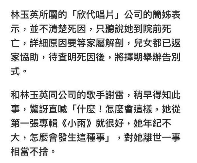 6日台湾58岁“甜歌皇后”林玉英在家中突然离世,因生前曾遭受过家暴,不敢回家露宿公园长椅,所以警方准备解剖尸体确认死因,其儿子林小烈也表示:“目前我妈还在板桥殡仪馆,死因还在调查中,谢谢大家 。”