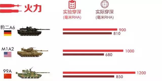 99A可以正面击穿世界上所有主战坦克的前装甲(它自己的比较勉强),而其它所有坦克都无法击穿99A的主装甲。也就是说99A的盾扛得住所有对手的矛,而它的矛戳得穿天下所有的盾,包括它自己的。