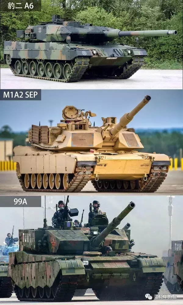 讲完99A自身的改进,再来和世界一流的主战坦克横向比较一下。99A出现后,世界现役主战坦克排行榜比较公认的三强是M1A2 SEP、豹二A6和99A。豹二A7只是城市作战增强性,增强了侧后方的全向防护,三大主要性能并没有显著提高,而且未大规模入役,所以不做考虑。