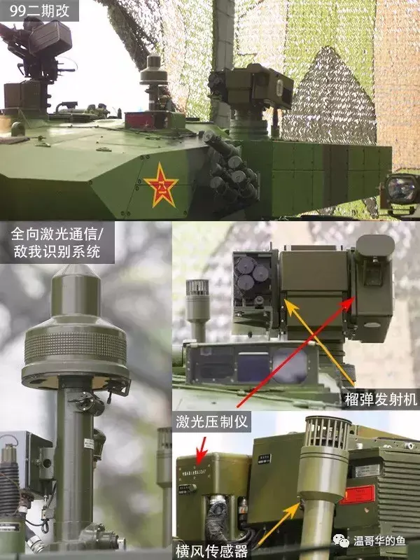 在99二期改及之前的两代99坦克上,都安装有独步全球的置顶激光压制干扰装置,能对敌方激光测距仪、星光夜视镜、电视摄影机、光学瞄准仪、红外线热像仪等一切可见光/近红外线光学电子仪器实施干扰,使之饱和失效,甚至造成永久性破坏,同时集成有破片式主动防护系统。