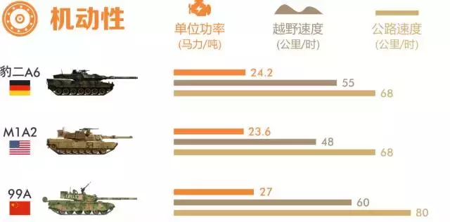 三型坦克的发动机都是1500马力。99A的车重估计值为55-58吨,单位功率约27马力/吨。M1A2 SEP为63.2吨(很多地方写为69吨,实为美式短吨,等于0.9公吨),单位功率23.6马力/吨。豹二A6为62.5吨,单位功率24.2马力/吨。99A的最大公路时速达到80公里,最大越野时速60公里,M1A2 SEP为68公里/48公里,豹2A6为68公里/55公里。机动性的排序为99A > 豹二A6 > M1A2 SEP,99A傲视群雄,全球第一。