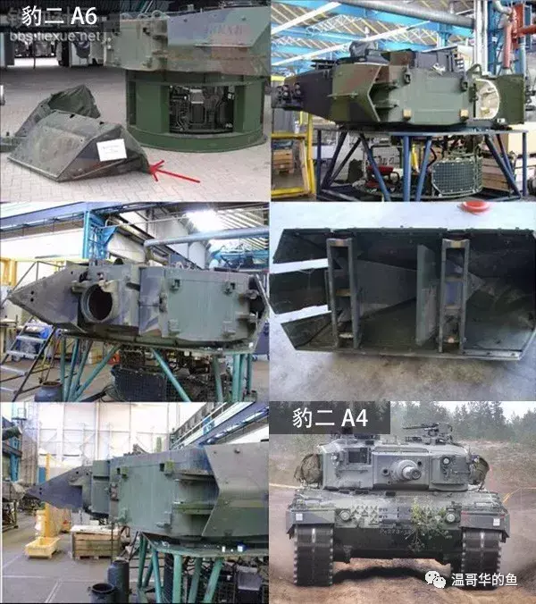 上图前五张是豹二A6楔形首装甲拆卸后的样子,可以看到后面的主装甲其实和A5之前各型的垂直装甲是一样的。增加的楔形部分内部是空心的,外壳是相当薄的装甲板,也没有附加装甲。内部还增加了两片装甲,只能起到提前引爆破甲弹的作用,对脱壳穿甲弹并没有显著的防护效果。难怪该结构曝光后,军迷笑称豹二系列多年来都是在裸奔。