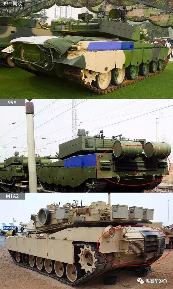 99二期改及之前所有的国产坦克,发动机进气格栅都只开在动力舱顶部。99A在车尾增加了大型进气口,和使用燃气轮机的M1A2十分相似(上图红圈部分),这也说明它的动力系统进行了相当的升级。