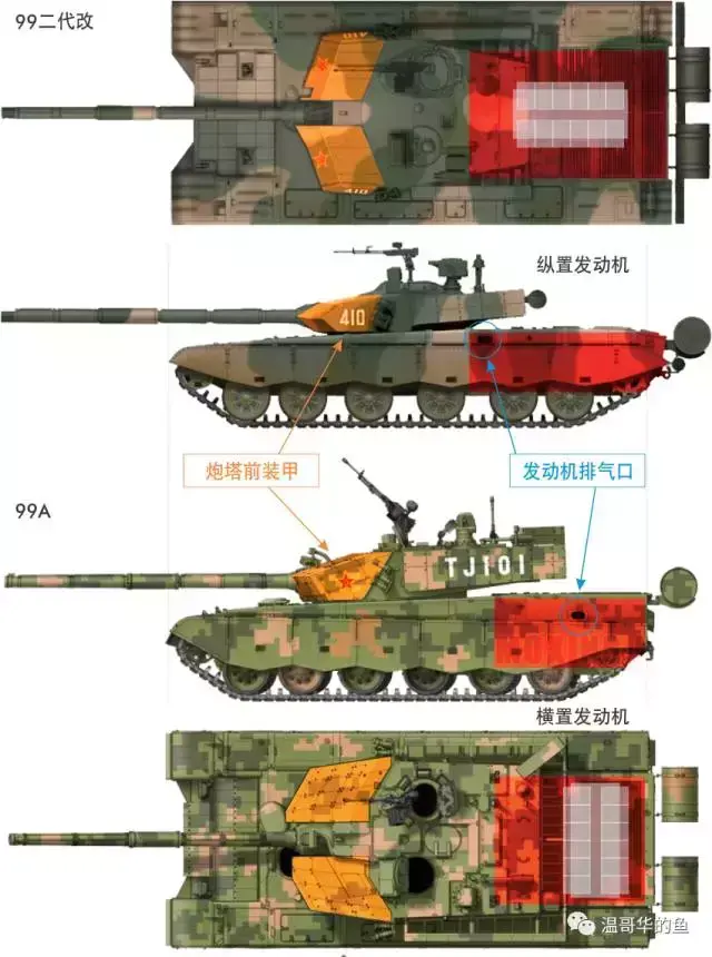 一个很明显的变化就是99A的动力舱加厚了很多(对比下图蓝色部位),同时空气清洁过滤装置采用了类似M1A2的双过滤体制,可强化发动机在沙尘环境下工作的可靠度,使坦克更加适应山地、荒漠等恶劣环境,因此尾部变动很大。