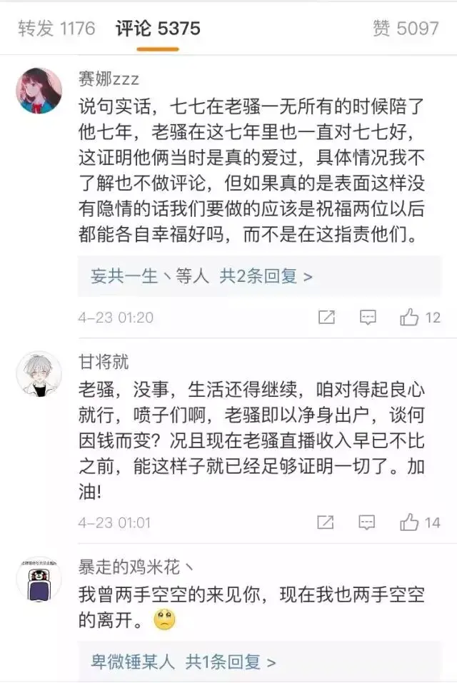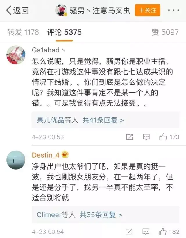 很多网友直言不能接受:“怎么说呢,只是觉得,骚男你是职业主播,竟然在打游戏这件事没有跟七七达成共识的情况下结婚。你们到底是怎么做的决定呢?我知道这件事肯定不是某一个人的错。可是我觉得有点无法接受。 ”还有网友则是比较理性:“说句实话,七七在老骚一无所有的时候陪了他七年,老骚在这七年里也一直对七七好,这证明他俩当时是真的爱过,具体情况我不了解也不做评论,但如果真的是表面这样没有隐情的话我们要做的应该是祝福两位以后都能各自幸福好吗,而不是在这指责他们。 ”