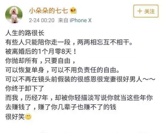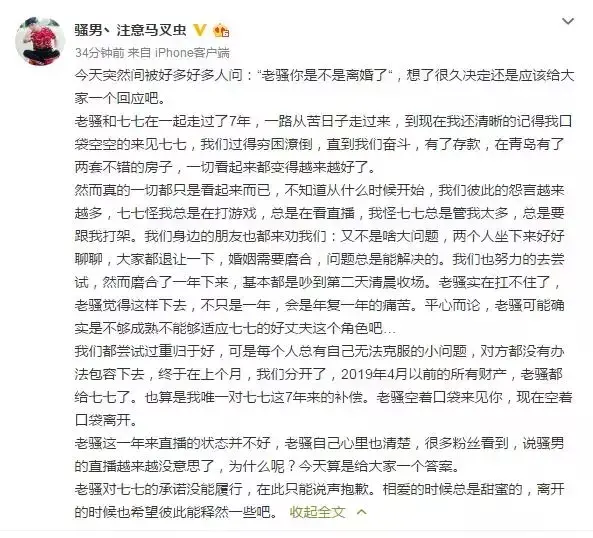 紧接着骚男离婚上了热搜,事情愈演愈烈,骚男也是深夜发长文回应离婚的原因直言:结婚后双方性格不合,基本每天都吵架,已经到了无法解决的地步,只能选择离婚!而且自己觉得挺对不起七七,所以选择净身出户!