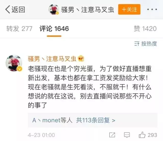 面对喷子,骚男选择怒怼:“老骚现在也是个穷光蛋,为了做好直播想重新出发,基本也都在拿工资发奖励给大家!现在老骚就是生死看淡,不服就干!有什么想说的就在这说,别去直播间说那些不开心的事了 !”