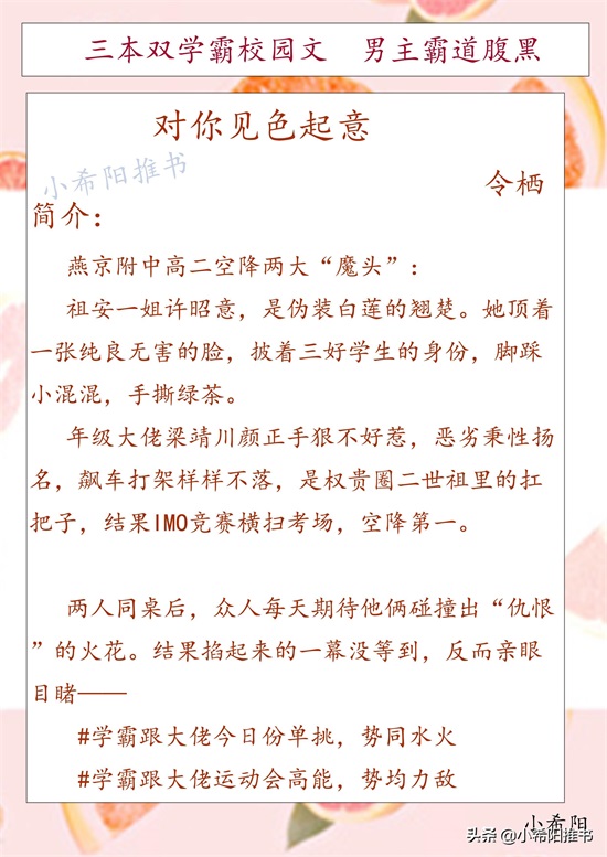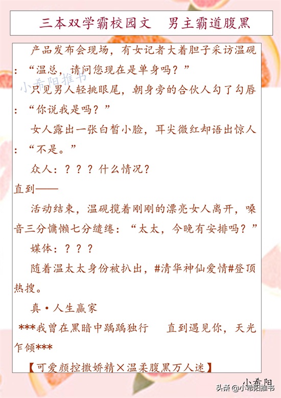 简要概括:这本从校园到都市,剧情很甜。两人的人设,女主学霸傍身,外表柔弱乖巧实际很不好惹,手撕绿茶暴打小混混;男主校霸打架出名,没想到校霸还是真学霸。