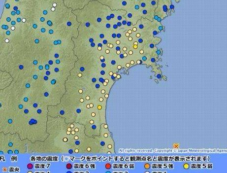 日本气象厅数据指出,在福岛县外海、北纬37.7度,东经141.7度的地方,在日本时间晚间7点23分发生芮氏规模6.2地震,地震深度50公里,在福岛县、宫城县、青森县、岩手县、山形县都出现震度5级至3级不等的有感地震,目前没有海啸的危险。