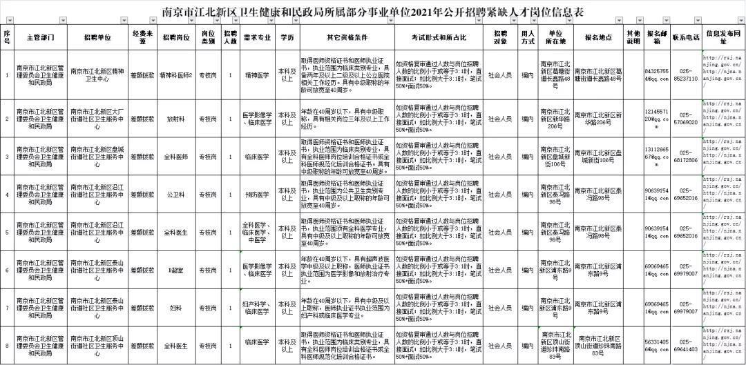 本次招聘相关信息在南京市人力资源和社会保障局网(http://rsj.nanjing.gov.cn)、南京江北新区网(http://njna.nanjing.gov.cn/)以及各招聘单位网站上发布,具体招聘单位、岗位、数量、资格条件等详见《南京市江北新区卫生健康和民政局所属部分事业单位2021年公开招聘高层次卫技人才岗位信息表》、《南京市江北新区卫生健康和民政局所属部分事业单位2021年公开招聘紧缺人才岗位信息表》。