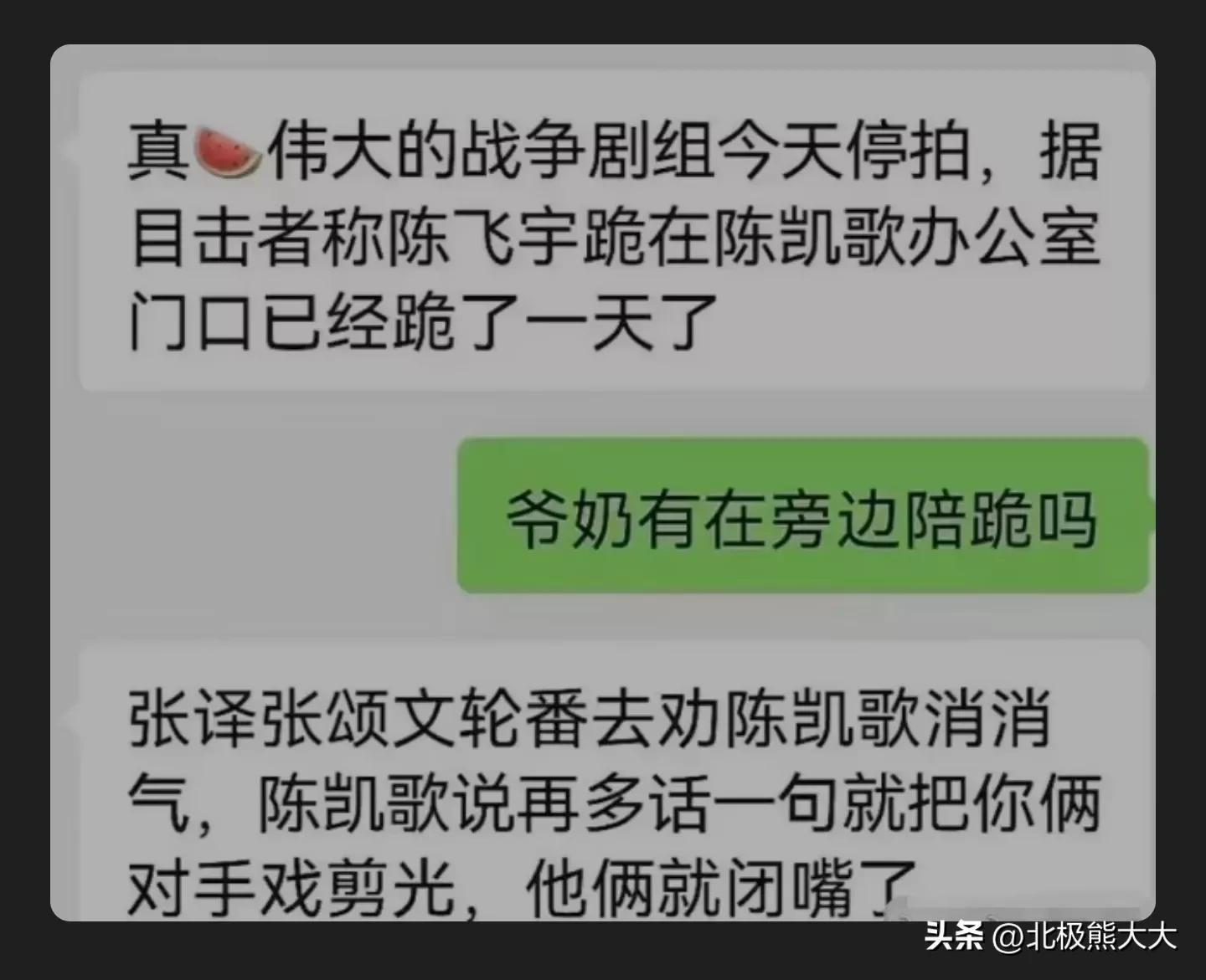 在气头上的陈凯歌怒不可遏,没有轻易原谅陈飞宇,就连张译和张颂文轮番去劝陈凯歌消消气都没用,反而激怒了陈凯歌放狠话,再多嘴就要剪光他俩的戏。
