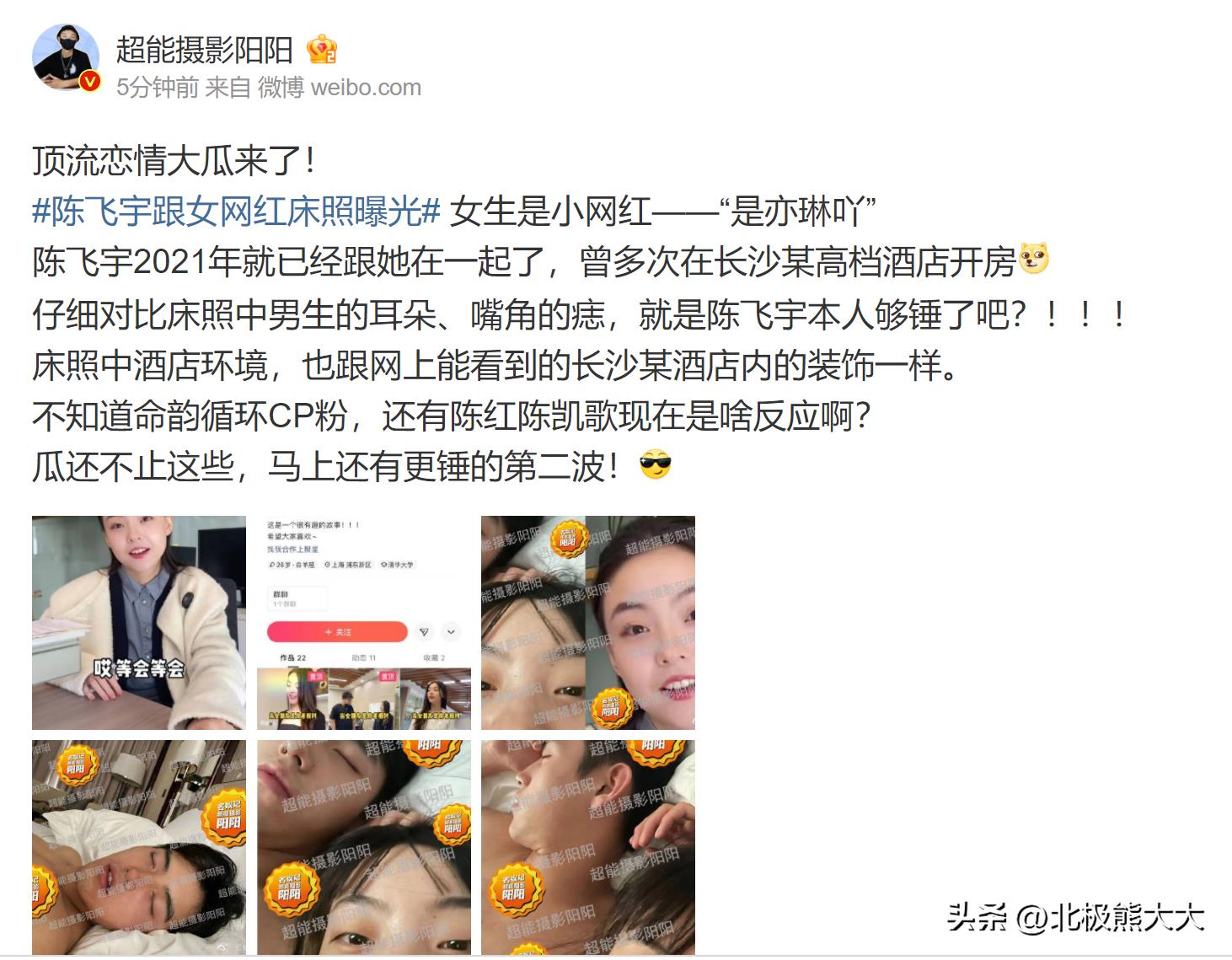 据娱记阳阳所言,陈飞宇照片中的女主角是一名昵称为“是亦琳吖”的网红,该网红是陈飞宇的站姐,而且已婚。