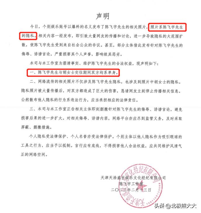 除此之外,工作室还澄清陈飞宇与胡女士(照片女主)交往期间双方均系单身,两人分手后女方才结婚的,不存在“睡粉”和“当三破坏别人家庭”。