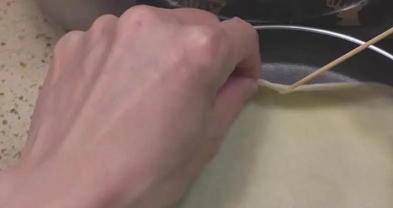 ③待千层皮开始冒出气泡使,我们可用牙签挑起千层皮的一端,随后揭起翻个,翻面摊至2到3秒就可以将千层皮倒扣出来。