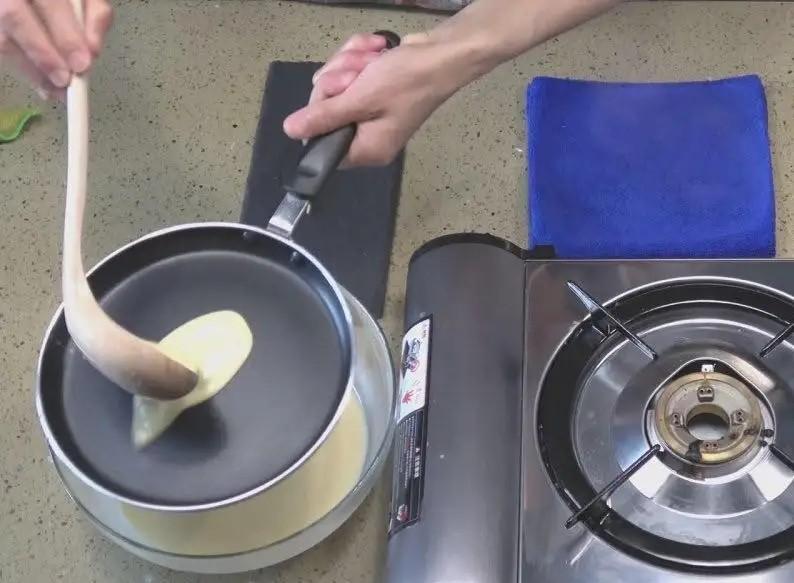 (如果大家在摊的时候发生粘锅,我们可在预热的时候,在锅内放一小块黄油进行润滑,保证不粘锅)
