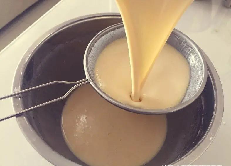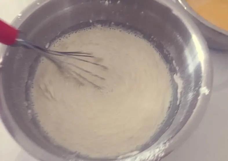 ④将牛奶加热至手温,随后倒入蛋黄糊中搅拌均匀。