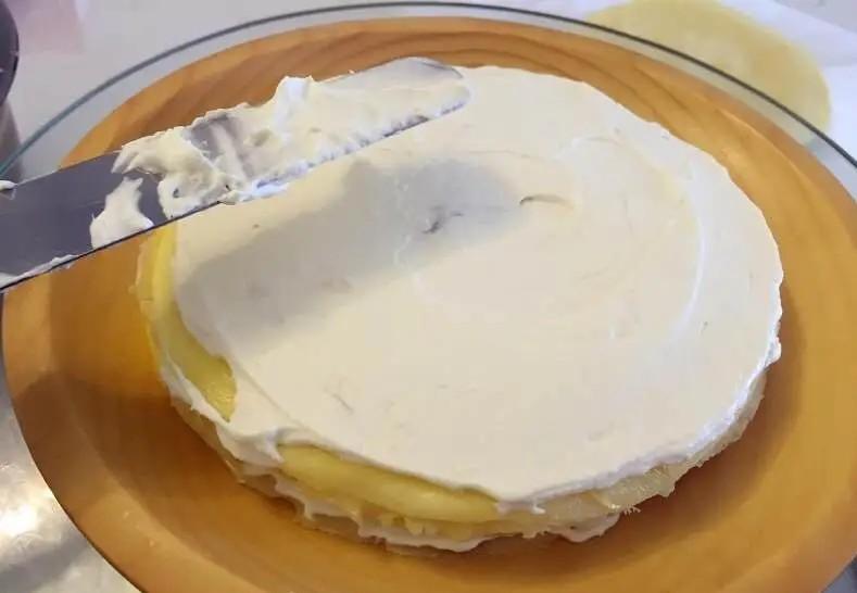最后一步便是我们的成品组装部分,转盘上面放一个底托,将第一张千层皮放在中间,陌上我们制作的榴莲内陷,然后盖上一层千层皮,就这样重复操作就可以了。