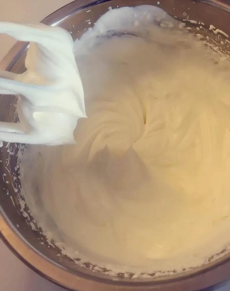 ①将糖粉倒入淡奶油中打发,夏季时我们可以在底部垫一些冰,这样可以使淡奶油更容易打发,打至弯钩状即可。