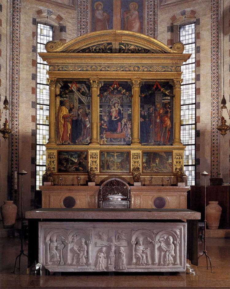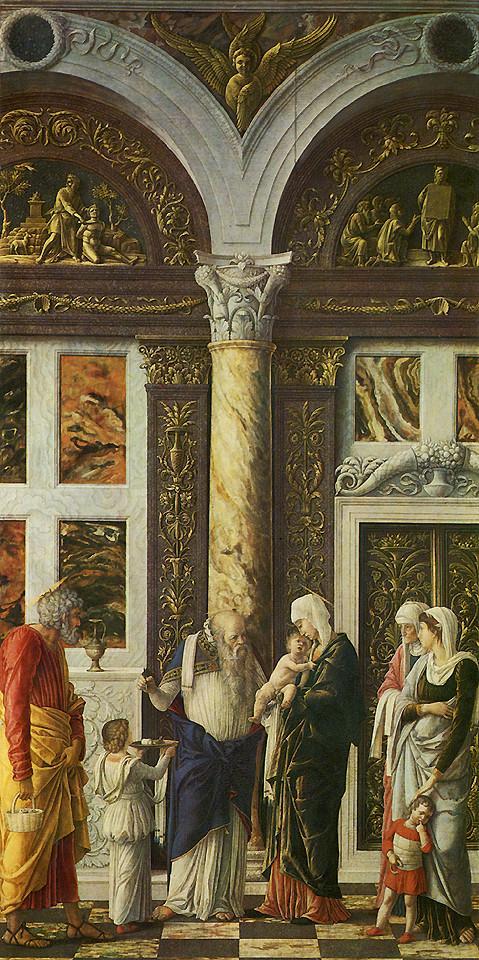 这里的殉道者被绑在一根象征罗马凯旋门的柱子前,人已被乱箭射死,其中一枝箭是从殉道者的下颏射出前额,表明乱箭是从四面八方射来的。后面的柱式是科林斯式,似乎说明背景的建筑已近于罗马5世纪前的公共建筑物。画家想通过这些细节表明一个真实的历史环境,但由于受到透视原理的局限,画面背景与人物并不显得协调。如果把这幅画看成是揭露古代暴政的历史题材,倒也许能使我们对曼特尼亚的艺术有更多的崇敬。当时这种画除了以壁画形式表现外,还有绘制在木板上的,这一幅画就是木板画,它作于1455至1460年间。 曼特尼亚,原是意大利著名考古学家斯克瓦尔古涅的养子,在这位学者的影响下,画家对于历史与古代文物自小就产生浓厚的兴趣,而这正是人文主义艺术家的才智的又一重要方面。