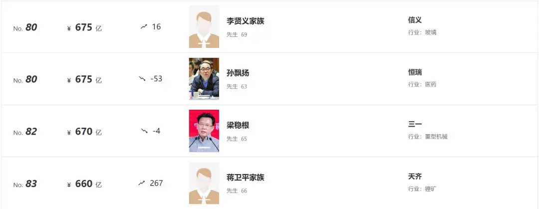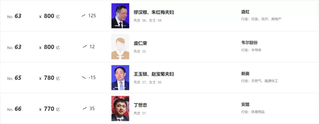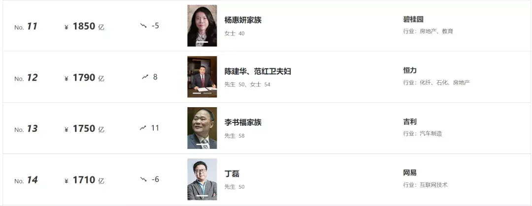 而排名升得最快的,要数今年的第七名——魏建军、韩雪娟夫妇,作为长城汽车的创始人,去年还只排在第89位,今年就凭借2180亿元的财富一跃升到了前十名。
