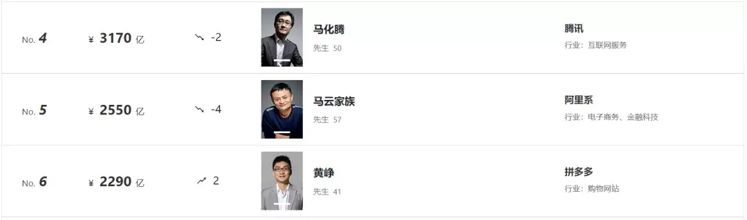 而紧随他之后的是字节跳动的张一鸣,财富总额为3400亿元,以及拥有3200亿元财富的宁德时代的曾毓群。而他们,都是首次进入前三。而我们熟悉的“二马”——马化腾和马云,今年分别位居第四和第五,位置都有所下降,而拼多多的黄铮从第二跌到了第六。