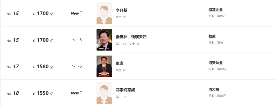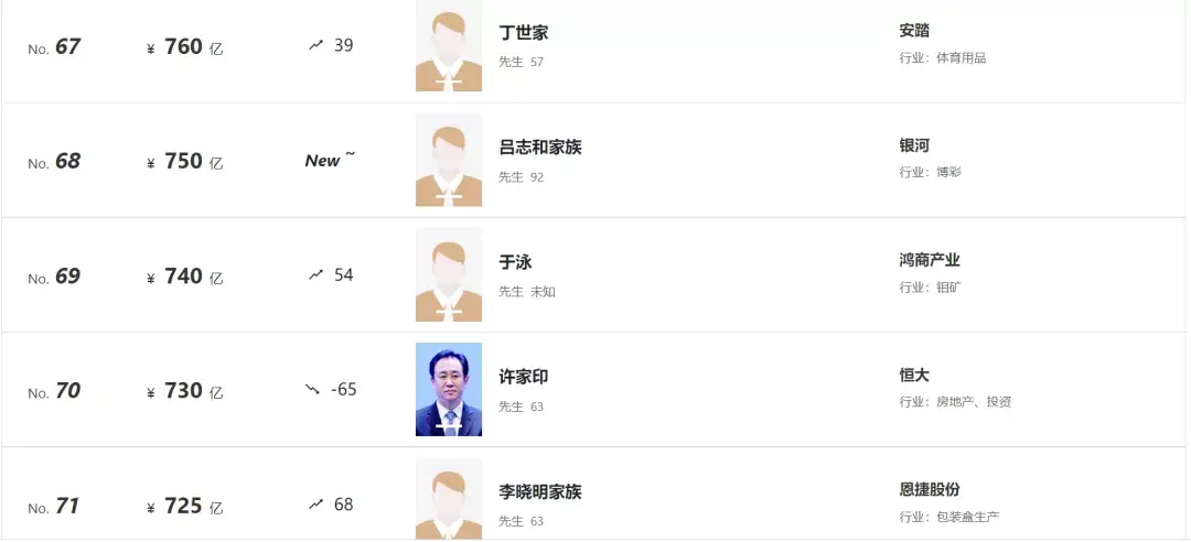 而世茂集团的许荣茂下降了17、万达的王健林下降了11、龙湖的吴亚军下降了16……而最为夸张的就是恒大集团的许家印,直接从去年的第5,下降到了今年的第70名,财富呈过山车式的缩水了。曾几何时,许家印也当过首富,地产过热的年代已经一去不复返了。