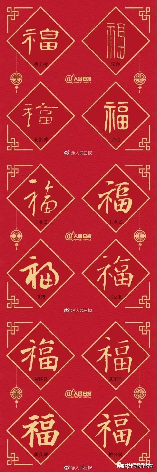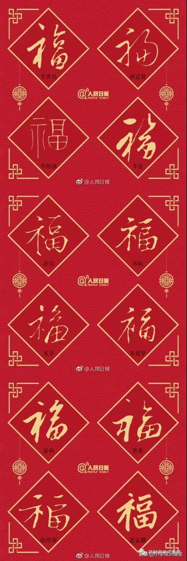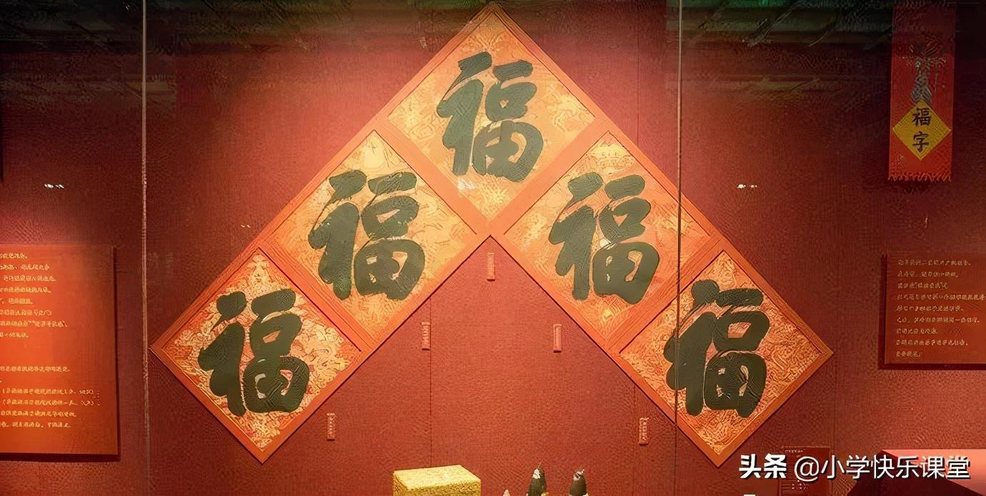 (在故宫博物院展出的 " 清代五帝福字图 ",自右及左分别是康熙、雍正、乾隆、嘉庆、道光五位清代皇帝所书写的福字。)