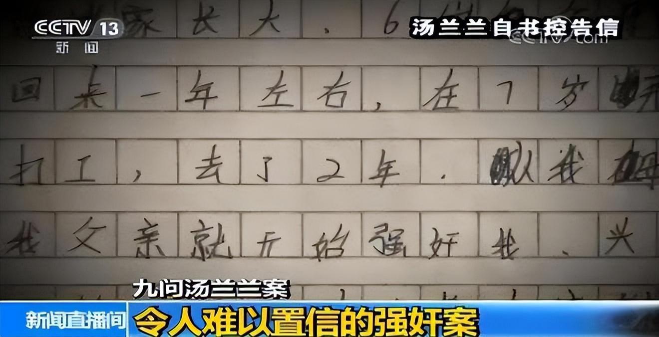 汤兰兰亲手递给民警一封举报信,并讲述了自己从6岁起就遭到数十名亲友的性侵,其中包括自己的父亲和爷爷。
