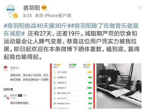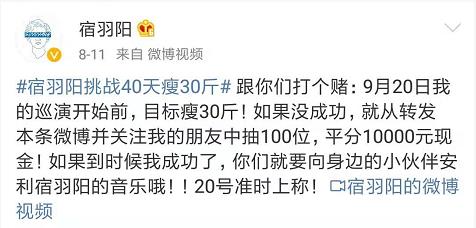 2019年,属于宿羽阳的“十一种孤独”全国巡演将在9月20日起走完15个城市,首站沈阳,最终回到北京。没成想,在就要上路前的半个月前,宿羽阳和我们临时做了个大胆的决定,那就是“40天挑战减重30斤”,欢迎大家都去她的微博围观见证:失败的话,100人还能平分10000元;成功的话,也会有100人收到我们寄出的惊喜。