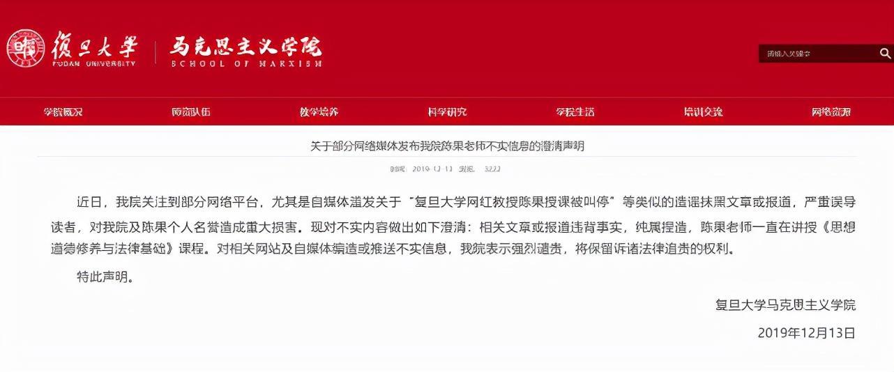 近日,我院关注到部分网络平台,尤其是自媒体滥发关于“复旦大学网红教授陈果授课被叫停”等类似的造谣抹黑文章或报道,严重误导读者,对我院及陈果个人名誉造成重大损害。现对不实内容做出如下澄清:相关文章或报道违背事实,纯属捏造,陈果老师一直在讲授《思想道德修养与法律基础》课程。对相关网站及自媒体编造或推送不实信息,我院表示强烈谴责,将保留诉诸法律追责的权利。
