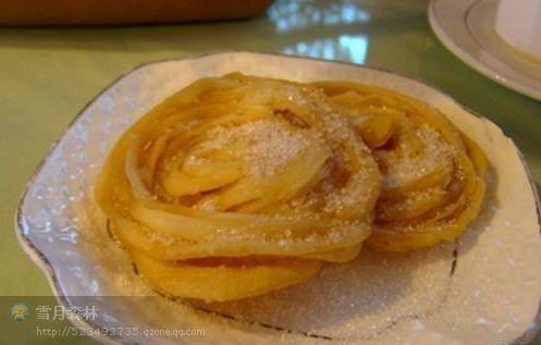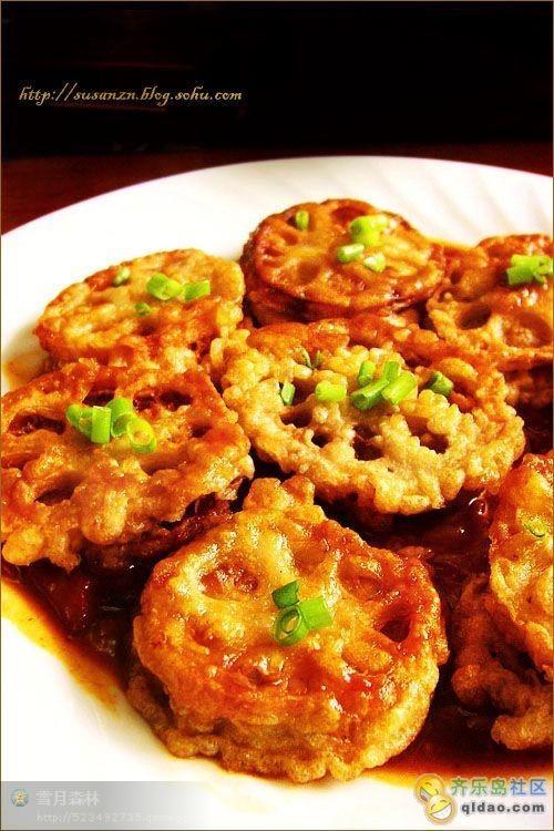 两片藕中间夹着肉馅,通过混合着面糊炸过,酥脆可口,配上酸辣的蘸酱更是美味无穷!