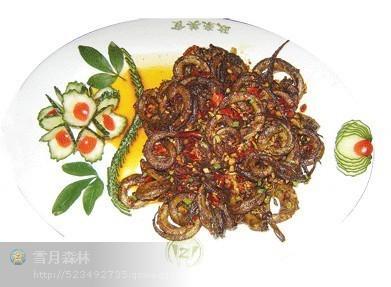 盘鳝是将不能动刀剖肚的豇豆鳝鱼放入烧热的铁锅内让它自蹦身亡,除去粘液后,用清水洗净,再入锅放上麻油,微火反复煎之,待鳝鱼由硬变软成卷曲时,放入盐、花椒、姜、蒜、红辣椒丝及麻辣酱等调料,干扁成焦黄色,熟至香气扑鼻,盛盘食之。