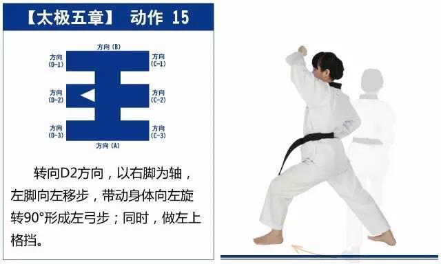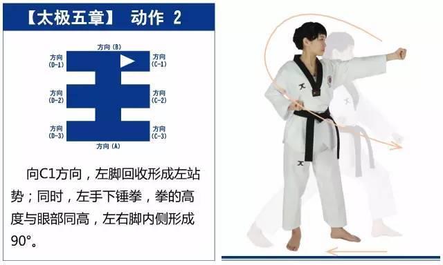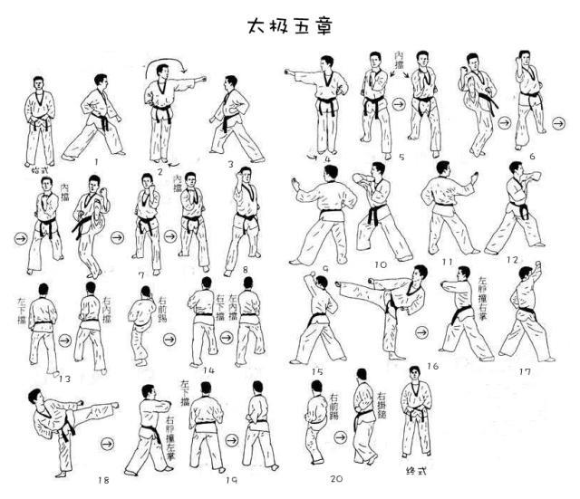 构成:太极五章共20个动作,新动作有侧向开立步、前后交叉步、横击肘和锤拳(砸拳)。