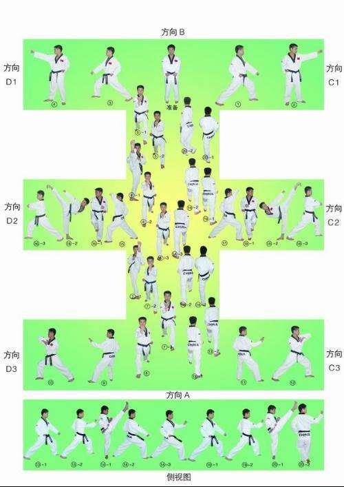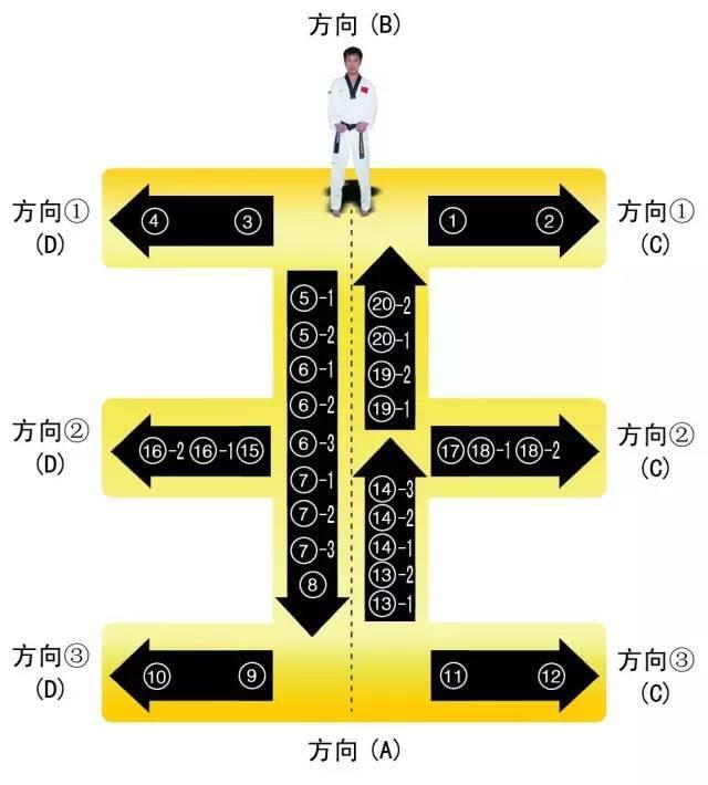 太极五章的进行线路最终形成一个“王”字,从起点开始,最终回到起点,共20个动作。
