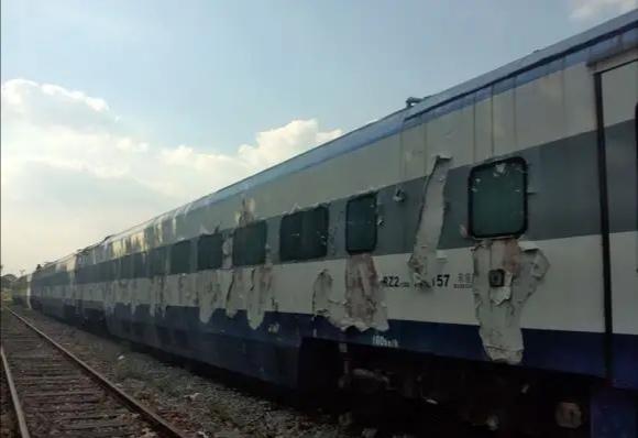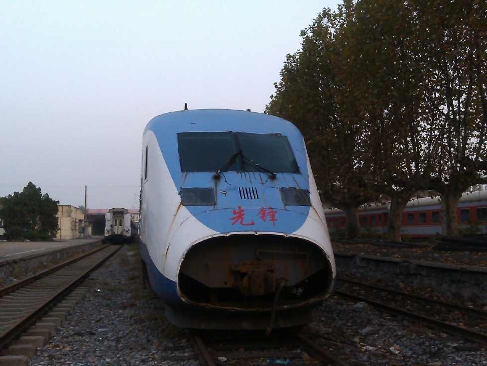 先锋号动车组返修后一直停放在南京北站(浦口),由于无人进行机台保养与维护,其表面喷漆等已经脱落。