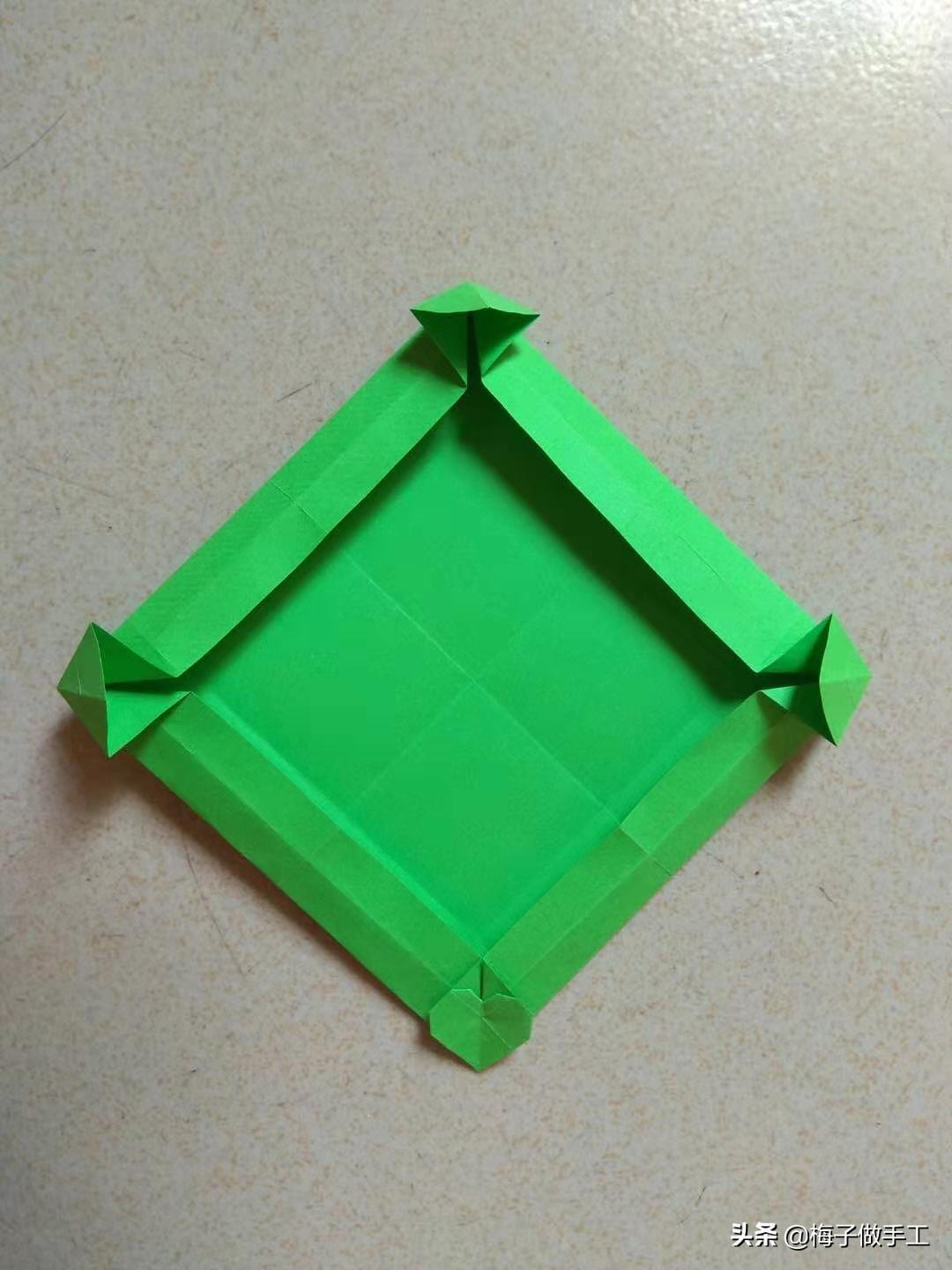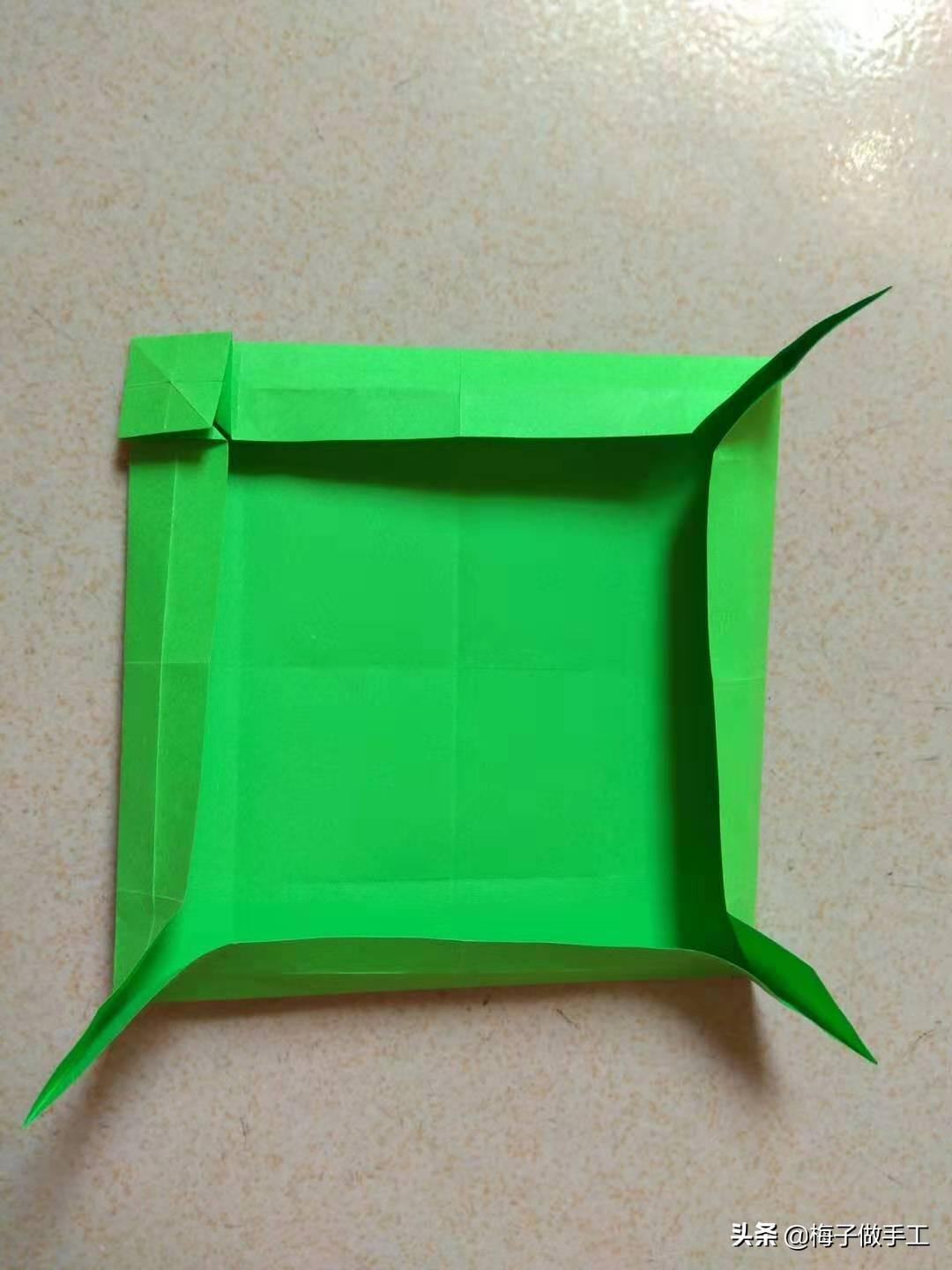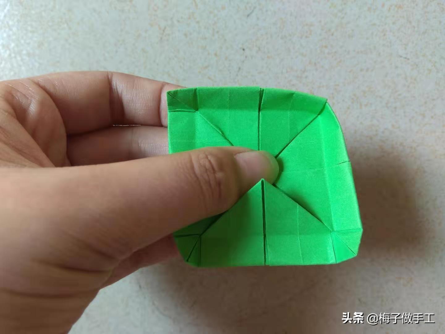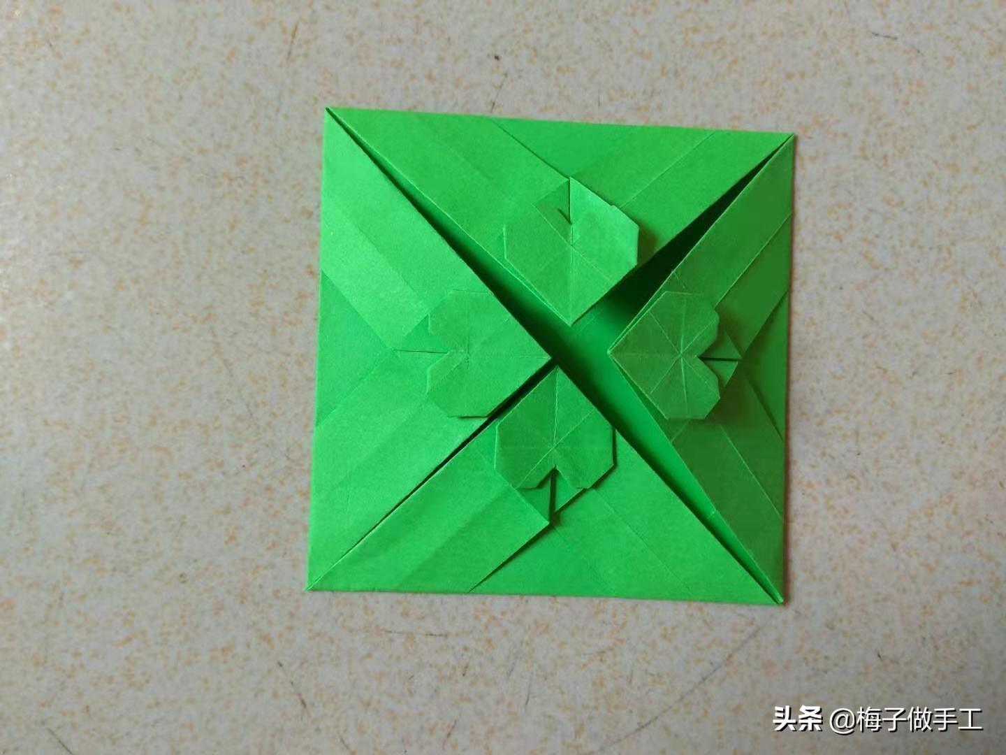 12、把其中一个角打开,然后把相邻边的夹角向里折,再把这个角放下来固定好,其它三个角依次翻折好,一个四叶草盒盖就折好了。
