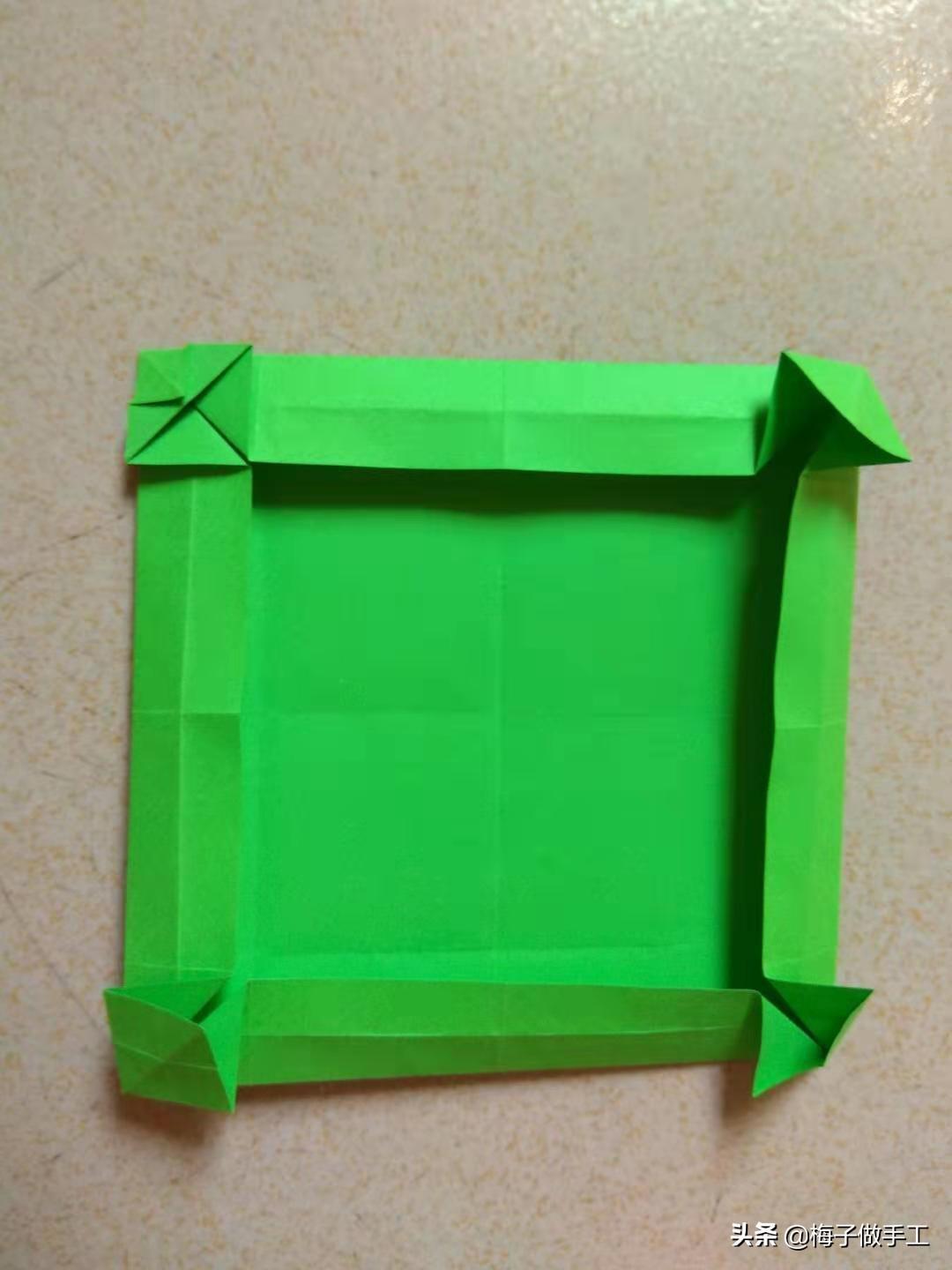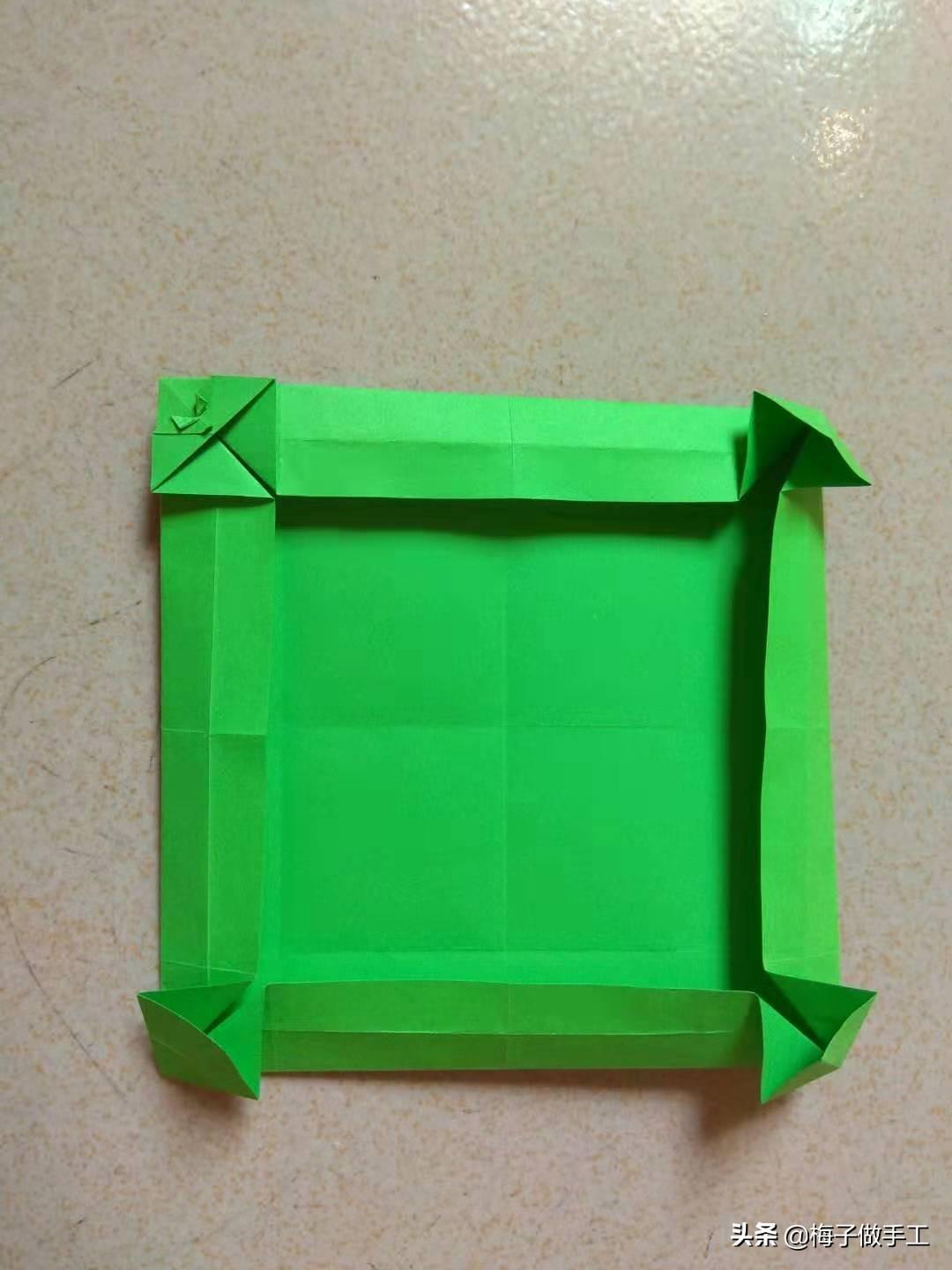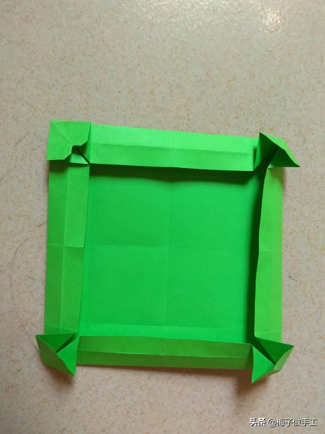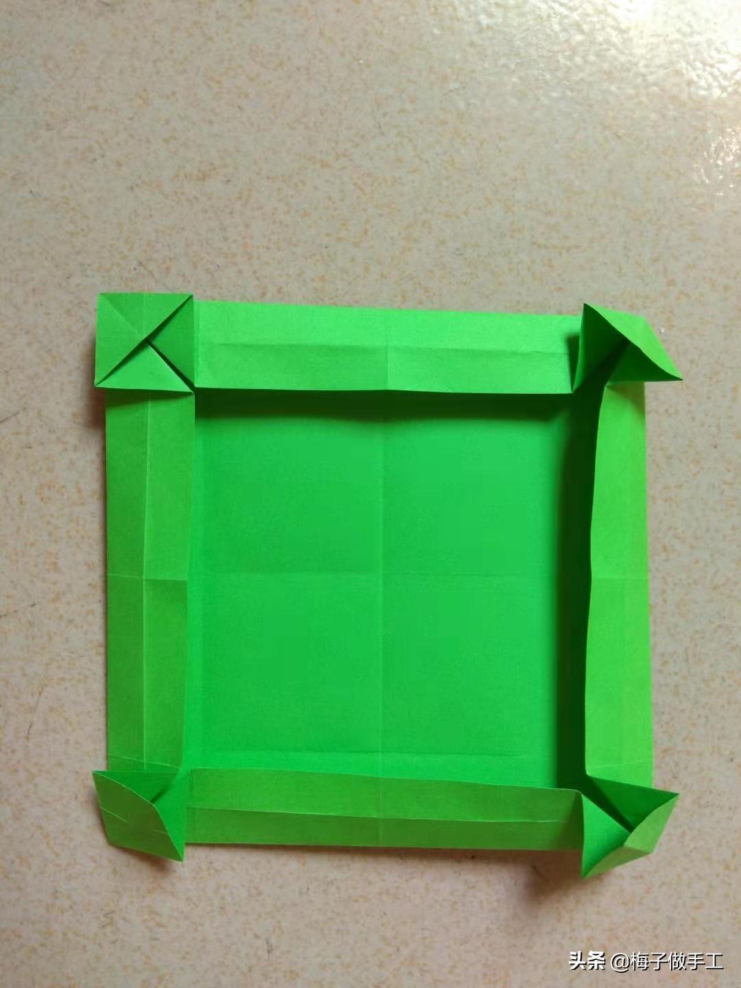 12、把其中一个角打开,然后把相邻边的夹角向里折,再把这个角放下来固定好,其它三个角依次翻折好,一个四叶草盒盖就折好了。