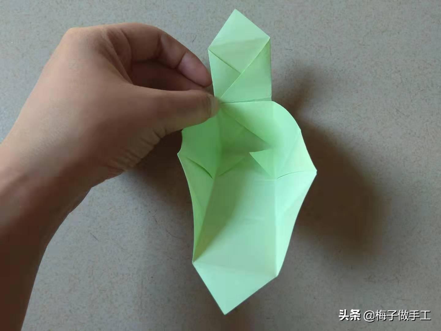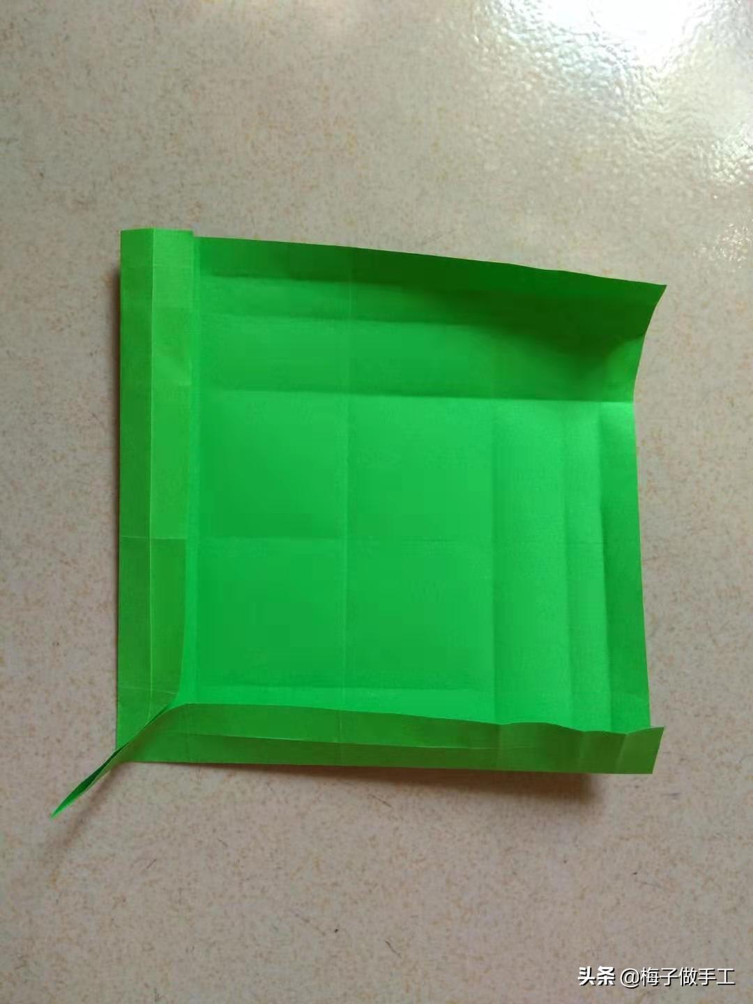 16、把左右两个角打开,上下两边沿着折痕竖立。