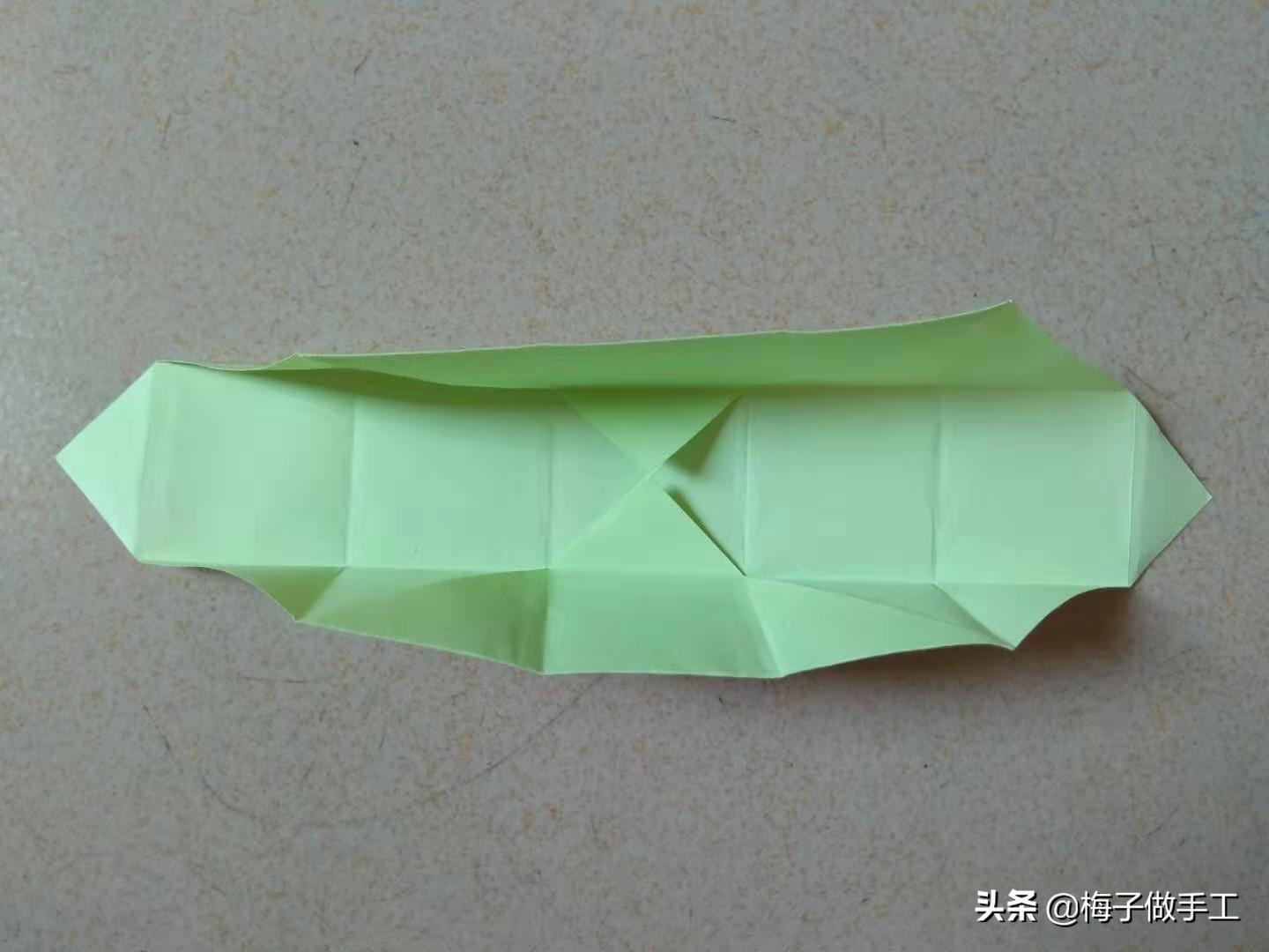 17、打开的一端按照折痕向内折,再把上面的部分翻折下来,另一端折法一样;一个盒身就折好了。