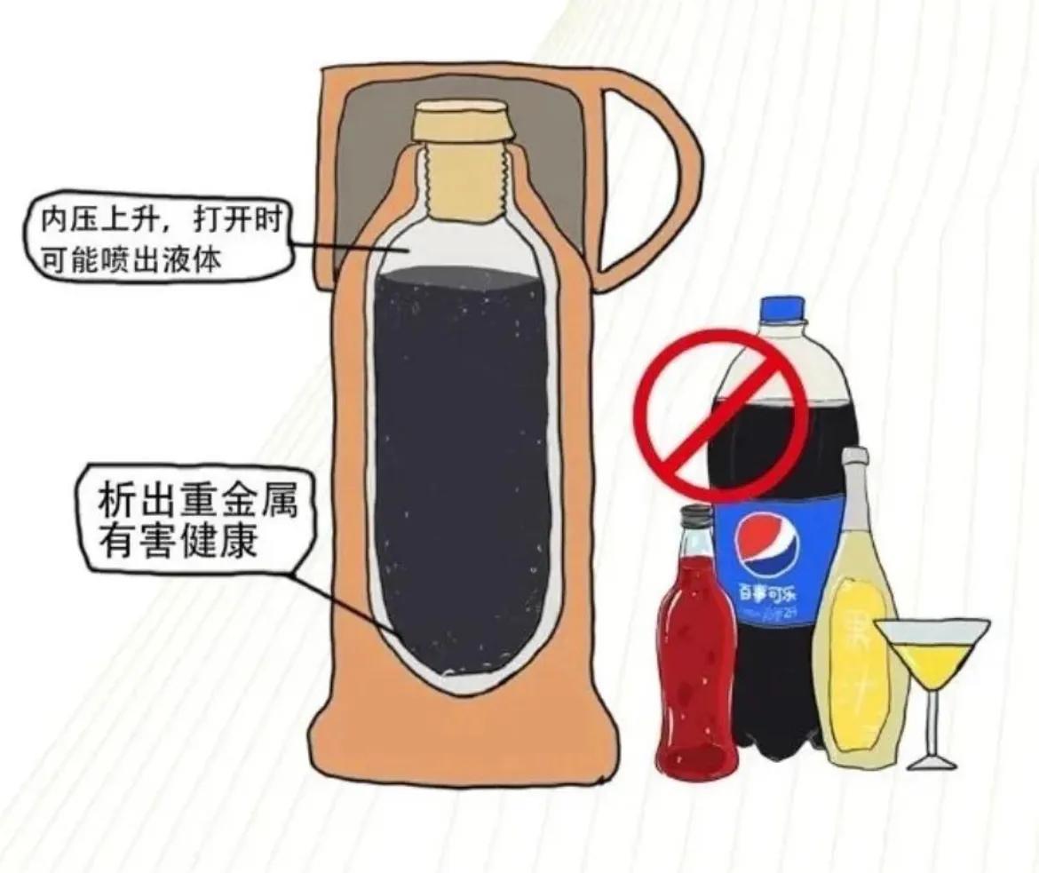 利用糖分,加上保温杯适宜的温度环境,微生物便会开始发酵,产生大量的二氧化碳等气体。众所周知,保温杯的密封性比一般的杯子好,因此,产生的气体也就无法外溢,一直堆积在瓶内,这便使杯内的气压不断增大, 累积到一定程度时,就会产生爆炸,严重时甚至会给人造成伤害。