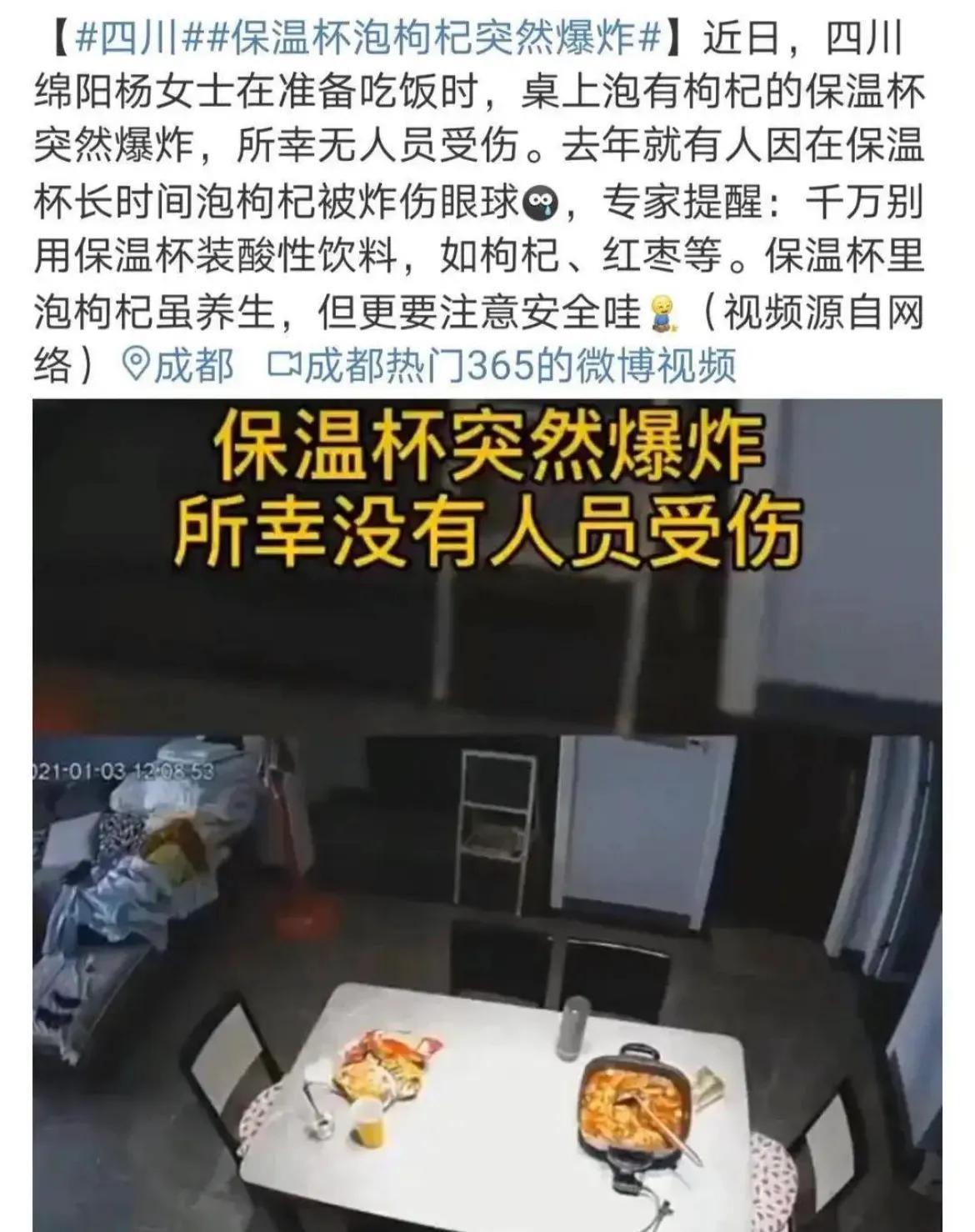 看到这里,你可能觉得这只是一场意外,枸杞不背这锅!那么请你再看看另外这个新闻。家住福州的小冰(化名)用保温杯泡了枸杞,喝了没几口之后便出门与朋友聚会,回来也忘记了这件事,直到十几天后才想起来。然而就在她准备清洗保温杯的时候,刚刚拧开瓶盖,保温杯便发生了爆炸。