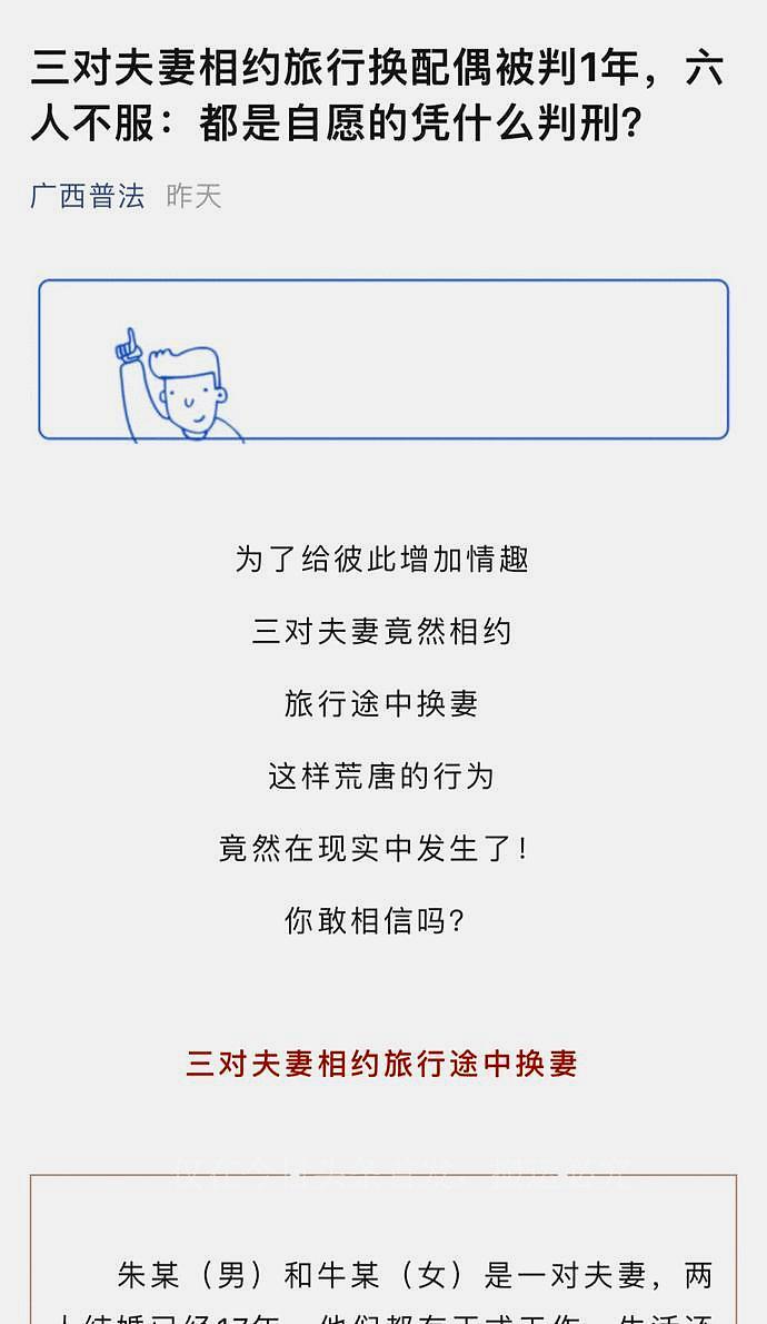 值得注意的是,这一案例不仅仅反映了中年人在婚姻中所面临的困境,也引发了对法律边界的思考。在案件审理中,六名涉案夫妻均以"你情我愿"为由辩解,认为这是在私密的场合进行的行为,不存在聚众淫乱罪。他们认为,因为这些行为是在隐秘状态下进行的,不会影响公共秩序。