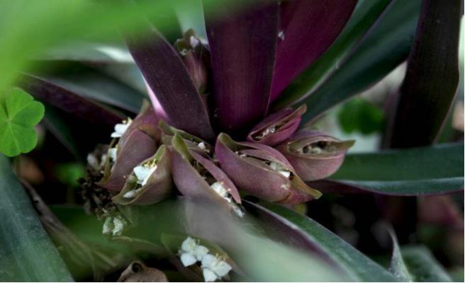 紫背万年青的叶子层叠互生,其叶面颜色是深绿,叶背颜色是紫红。当花即将开的时候,首先会从叶下层的叶腋中抽出一个个像蚌一样的紫色花苞,因此紫背万年青的一个别名蚌花就是这么来的。