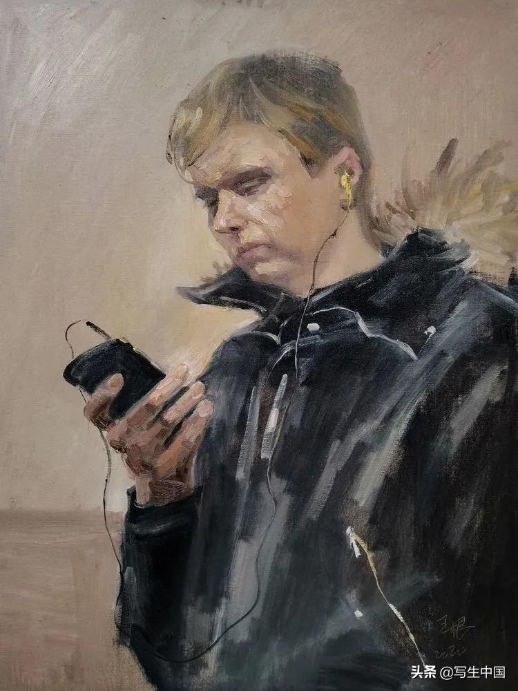 《莫斯科地铁看手机的青年》油画 60x80cm 2020年 王根