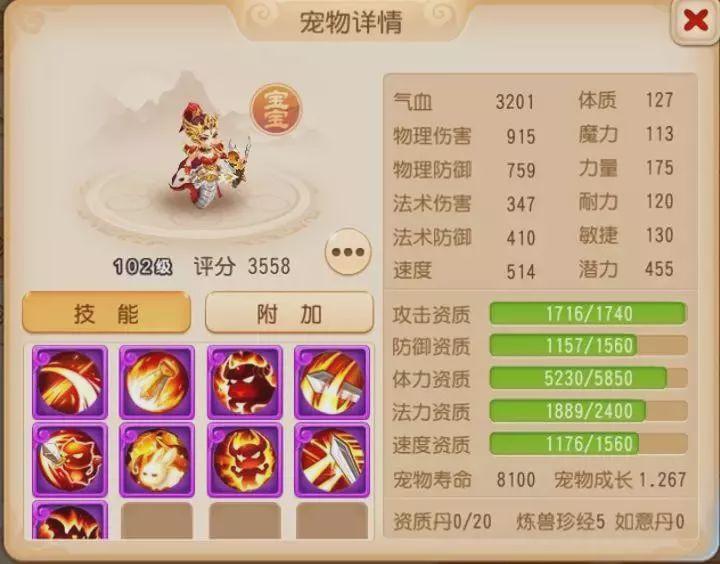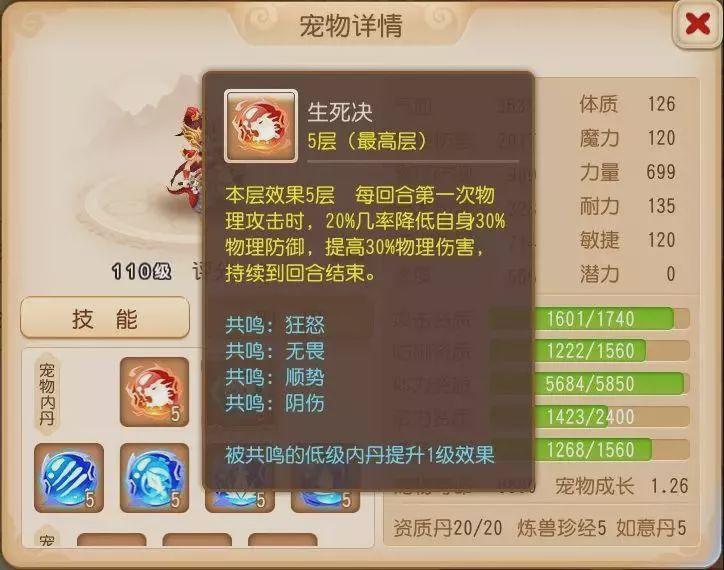 在技能搭配方面,首先打上必备的生存技能高级神佑复生、高级强壮,再打上物攻宠的必备技能高级必杀、高级偷袭,其次是为其打上高级突进和高级强力,这两个技能能有效提升物攻的输出能力,最后还要打上一本高级反击,高级反击在受到物理攻击时有20%几率自动反击,同时拥有高级反击的宠物不会被宠物连击。在技能格子充足的情况下可以为其搭配上高级感知和高级驱鬼,高级感知能有效针对敌方的隐攻宠,十分适合PVP对决,而高级驱鬼则是敌方鬼魂宠的克星。