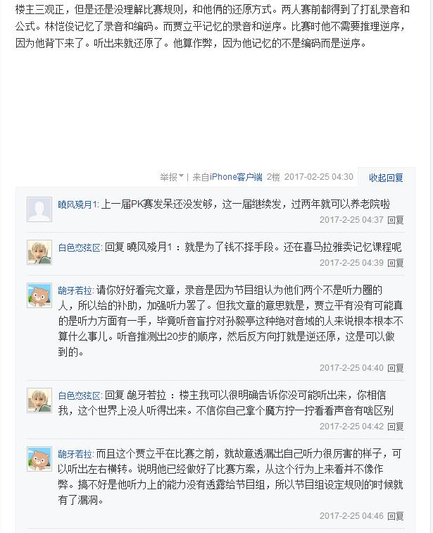 行了我要说的就是如此了,贾立平看情况应该是没有作弊,但是他利用了游戏的漏洞,用逆还原去完成了比赛,违背了魔方推理和记忆的基本原则,就这一点上来说,他的获胜应该算无效。包括节目组也该反思一下,有些选手具有多种能力,那么你们在出考题的时候,就一定要谨慎,最好不要去跨界搞一些脑残项目。比如,你出个主要依靠记忆和次要观察相结合的项目,然后让水哥和老外PK,水哥如果因为记忆输了比赛,难道这也算公平?