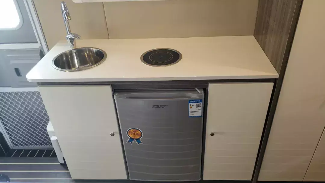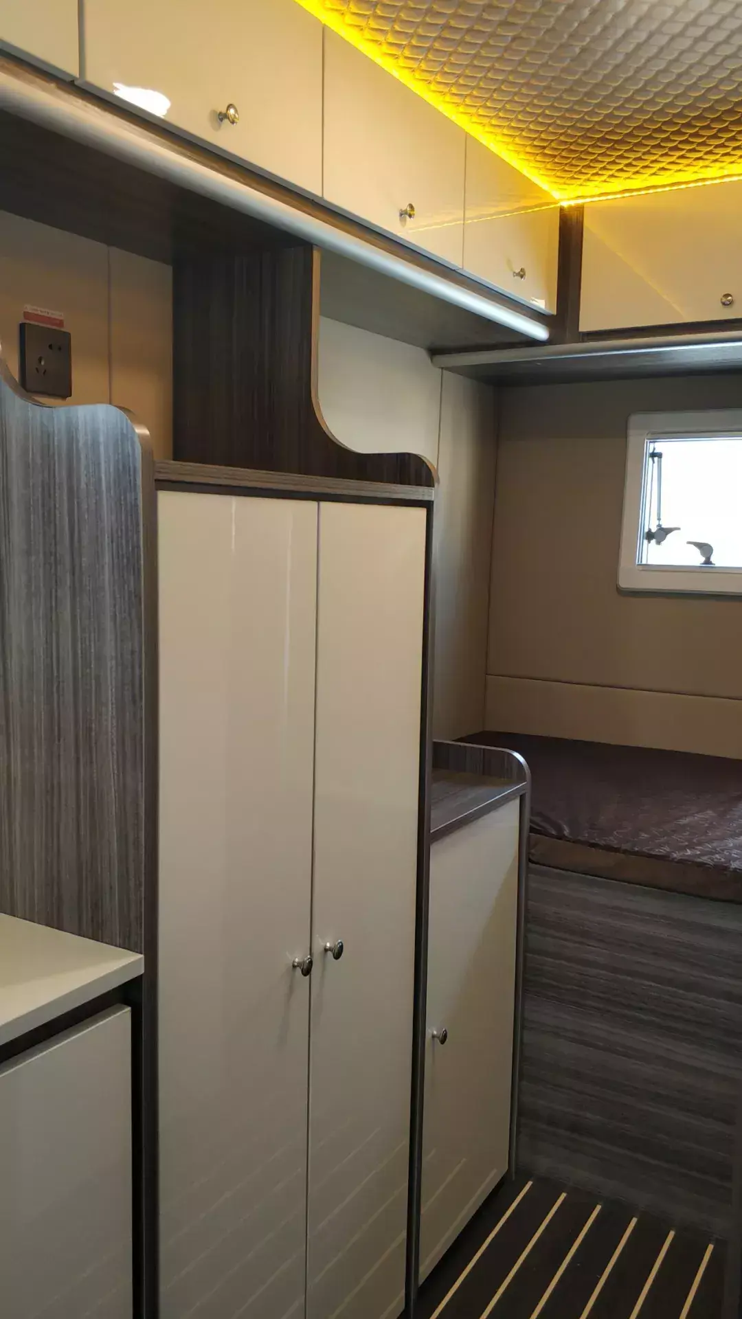 生活区方面,缔途房车厂家从材料选用、色彩搭配到装配工艺上都无不演绎着性价比的真谛。额头双人床尺寸为1950*1550mm,车尾也拥有一个1950*1200mm的双人床。对坐沙发、洗漱一体卫生间、多功能衣柜、室内厨房,冰箱等集中在生活区的中间部分,置身其中温馨而舒适。