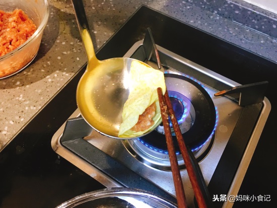 然后将调好的肉馅放到勺子的一头,将蛋皮像包饺子一样折过来,蛋饺就包好了