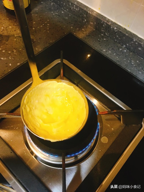 首先要准备一个圆圆的大汤勺,一小块肥肉,灶上开小火,将勺子烧热,用筷子夹住肥肉在勺子里滚一圈,烫出一层猪油,(这个小技巧是妈妈教的,这样做蛋皮不沾底,而且比植物油操作起来蛋皮成型更完美),滚了猪油后,再稍微烤一下勺子。