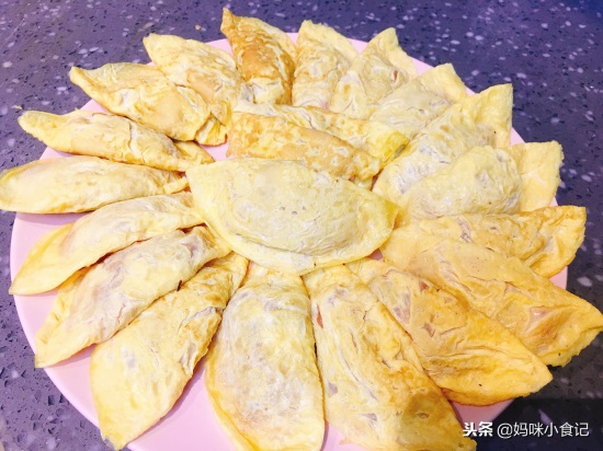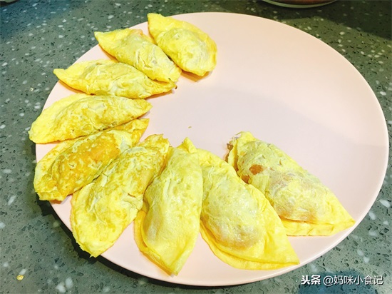 拿出码放到盘子里,重复这个步骤,直到把蛋饺都包出来为止。